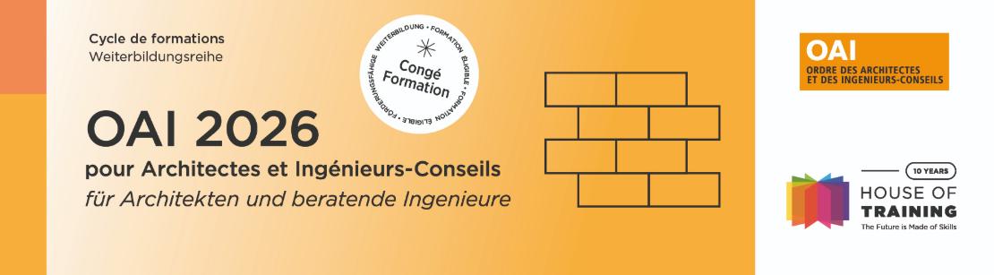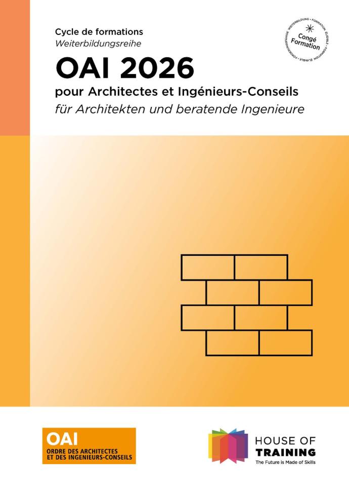 L’Ordre des Architectes et des Ingénieurs-Conseils (OAI) et la House of Training ont le plaisir de vous présenter le programme 2026 de formation professionnelle continue, conçu spécialement pour les membres de l’OAI, les cadres du secteur de la construction ainsi que les acteurs des secteurs public et communal.