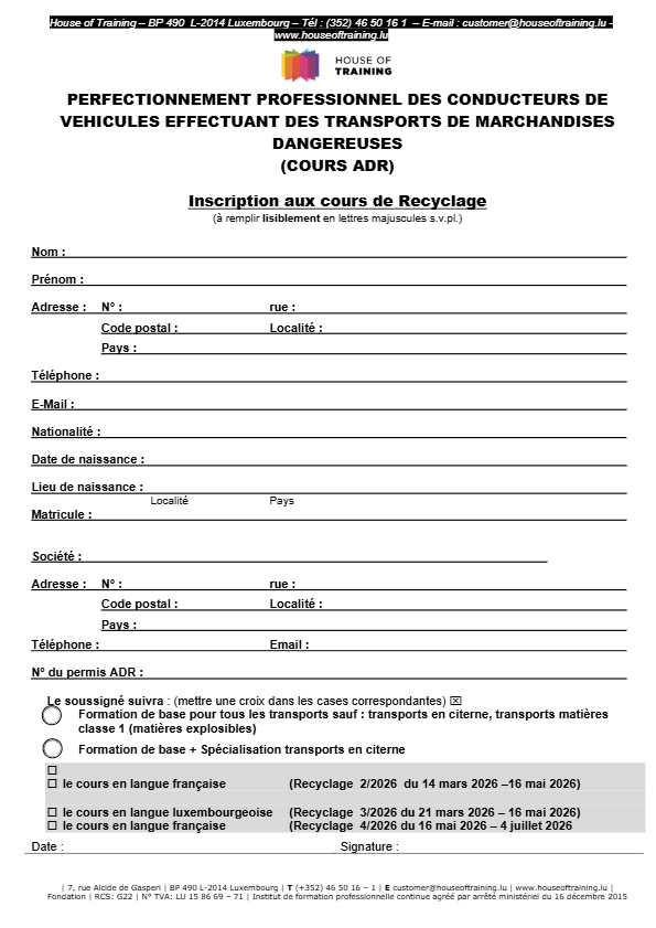 Perfectionnement professionnel des conducteurs de véhicules effectuant des transports de marchandises dangereuses (cours ADR) - Recyclage